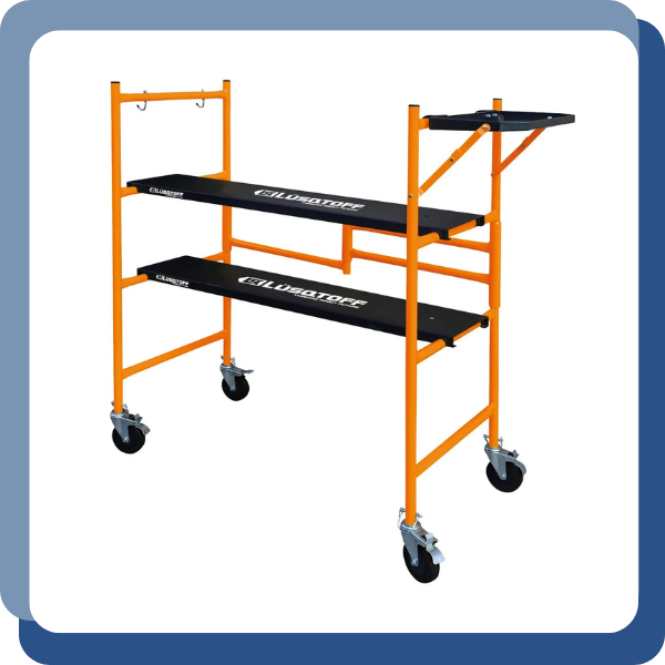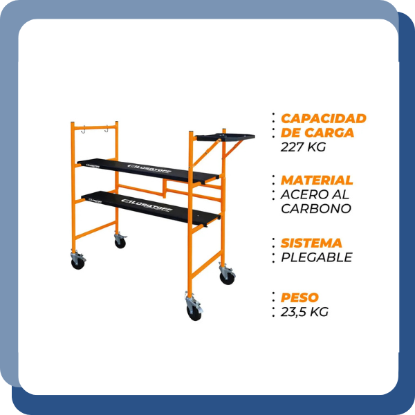 La plataforma de trabajo Lusqtoff MIAL225-8 es un equipo diseñado para realizar tareas en altura mediante una estructura de aluminio con altura regulable. Incorpora ruedas con sistema de bloqueo que permiten su traslado y